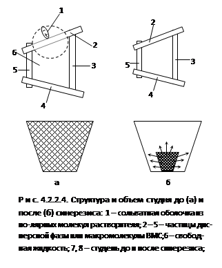 Для гелей характерен процесс старения. Он заключается в постепенном упрочнении структуры, ее сжатии и высвобождении части жидкости из структуры. Это явление называется синерезисом. Переход коагуляционной структуры в конденсационную - пример синерезиса. Синерезис заключается в сжатии каркаса студня или геля (рис. 4.2.2.4), изменении взаимного расположения частиц и выдавливании преимущественно свободной жидкости. Вследствие синерезиса стуктура сжимается, сохраняя первоначальную форму. Жидкость, которая выделяется при синерезисе, помимо свободной может включать часть связанной воды, в которой попадаются даже частицы дисперсной фазы. Так, сыворотка, выделяющаяся после образования простокваши, является слабоконцентрированным золем.
