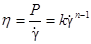 Исходя из экспериментальных исследований, графические зависимости напряжения сдвига от скорости деформации в логарифмических координатах часто линейны и различаются только тангенсом угла наклона прямой, поэтому общую зависимость напряжения сдвига Р от скорости деформации g можно выразить в виде степенной функции: