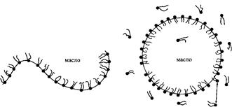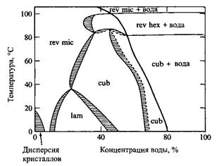 Мицелла с солюбилизированным маслом характеризуется положительной спонтанной кривизной. Обычно пленка ПАВ между маслом и водой обладает гибкостью и областями как положительной кривизны, так и отрицательной. Фазовое поведение полярных липидов - аналогия с фазовым поведением других дифильных веществ. Полярные липиды подчиняются тем же правилам, что и ПАВ, и обнаруживают сходное фазовое поведение. На рис. были приведены структурные формулы различных липидов; очевидно, что ассоциативное поведение в воде, например, существенно неполярных триглицеридов и сильнополярных солей желчных кислот совершенно разное. Действительно, три - и диглицериды недостаточно дифильны, чтобы растворяться в воде, и формируют самоассоциированные структуры. Другой предельный случай - соли желчных кислот, которые склонны к образованию лишь очень небольших агрегатов с большой положительной кривизной. Большинство других липидов по своим свойствам располагаются между указанными крайними случаями и образуют самоассоциированные структуры различных типов, как это следует из многочисленных фазовых диаграмм. Фосфолипиды, например лецитин, как и вообще ПАВ с двумя углеводородными цепями в молекуле, склонны к образованию ламелярных фаз. Ламелярная фаза может поглощать воду и набухать. При более высоком содержании воды система расслаивается на две сосуществующие фазы: ламелярную и очень разбавленный водный раствор. Моноолеин также образует ламелярную фазу, но только в очень ограниченном интервале концентраций и температур. Эта система весьма необычна, поскольку образует биконтинуальную кубическую фазу, которая, во-первых, устойчива в широкой области концентраций и температур и, во-вторых, сосуществует с избытком воды. В двухфазной области образуется дисперсия кубической фазы.