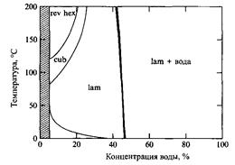 На фазовой диаграмме системы яичный лецитин - вода преобладает ламелярная фаза, которая при большом содержании воды находится в равновесии с очень разбавленным водным раствором.