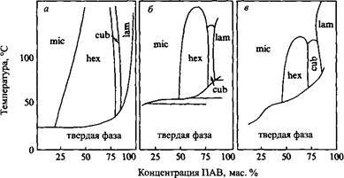 Стремление ПАВ самоорганизовываться в мицеллы гораздо ярче выражено в воде, нежели в других полярных растворителях. Это в основном справедливо и для других типов агрегатов, как, например, это проиллюстрировано на рис. для бромида гексадецилтриметиламмония в различных полярных растворителях. Следует отметить, что область существования фазы изотропного раствора становится более широкой, чем в воде, в то время как жидкокристаллические фазы характеризуются более узкими областями стабильности.