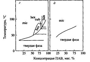Бинарные фазовые диаграммы бромида гексадецилтриметиламмония с различными полярными растворителями: а - с водой; б - с глицерином; в - с формамидом; г - с этиленгликолем; д - с Н-метил формами дом. При увеличении концентрации ПАВ наблюдается переход от мицеллярного изотропного раствора к гексагональной, затем к кубической и ламелярной жидкокристаллическим фазам.