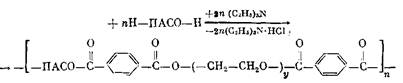 Регулярные блок-сополимеры с использованием в качестве удлинителей цепи гексаметилендиизоцианата (II) получали в две стадии в хлорбензоле при 353 К в присутствии 0,01% диэтилдикаприлата олова при взаимодействии заранее получен - от 1/М (1) и от степени поликонденсации х (2)