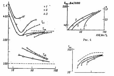 Рис. 3. Диаграммы состояния блок-сополимеров ПАСО — ПЭО при х=3 (1), 10 (2) в 30 (3). Штриховые линии — Тпл и Тс чистого ПЭО большой ММ Рис. 4. Зависимости Qajl и степени кристалличности а исследованных блок-сополимеров от содержания ПЭО при х—Ъ (1), 10 (2) и 30 (3) Рис. 5. Зависимость Тпл исследованных блок-сополимеров от молекулярной массы ПЭО-блока при х—Ъ (1), 10 (2) и 30 (3). Штриховая линия - зависимость Гпл чистого ПЭО от ММ
