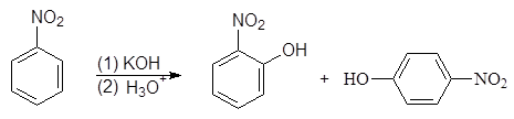 Нитрогруппа обладает сильно выраженным электроноакцепторным характером и оказывает значительное влияние на атомы и группы, находящиеся по отношению к ней в о- и п-положениях. Так, при нагревании нитробензола с порошкообразным КОН получается смесь о- и п-нитрофенолов: