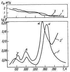 Рис. 2. Зависимость модуля упругости при растяжении (1, 2) и тангенса угла механических потерь (1', 2') исходного (1, 1') и окрашенного полиамида ПА-6 (2, 2')
