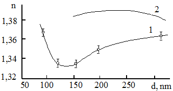 Как следствие проявления неоднородности химического состава по толщине слоя, следует рассматривать и размерные эффекты оптических свойств полимерных покрытий [43]. Показано, в частности, что зависимость показателя преломления ПТФЭ от толщины слоя является немонотонной: показатель преломления в приповерхностном слое имеет наибольшее значение, на расстоянии от подложки d=120–139 нм – минимальное и при дальнейшем увеличении толщины возрастает и достигает практически постоянного значения при d>1,0 мкм (рис. 4).