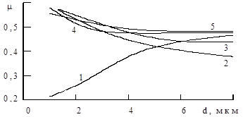 Рис. 5. Зависимость коэффи – циента трения пленок ПТФЭ от толщины при скорости скольжения 1,7 м/с (1); 3,5 м/с (2, 4); 5,2 м/с (3, 5): 1 – относительная оптическая плотность полосы 1720 см–1 (колебания карбонильных групп – С=О) 1‑D1720 / l = 0; 2, 3 – 0,7 мкм –1; 4, 5 – 1,5 мкм –1. |