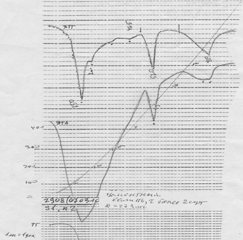 Проба находящаяся в тигле непосредственно взвешивается в самом дериватографе и помещается в печь. На предварительно проградуированной бумаге фиксируется четыре кривые: ДТА, ДТГ, ТГ и кривая повышения температуры в печи, на основании которых проводится обсчет полученых данных.