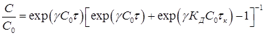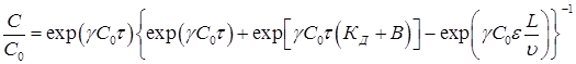 Первый член уравнения (39) отражает количество загрязнений, поступающих в адсорбер, второй – задержанных загрязнений, третий – остаток загрязнений в воде, четвертый (практически равен нулю в адсорбере с плотным слоем) – продольную диффузию. Решение (39) совместно с (38) позволяет получить выражение для определения эффекта очистки воды (С/С0):