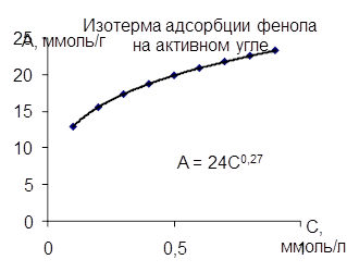 Адсорбция фенола на активном угле в области равновесных концентраций 0,1 – 1 ммоль/л описывается уравнением Фрейндлиха