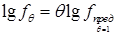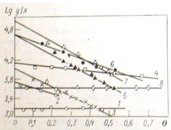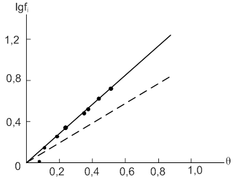 Рис.6. Зависимость lg fi от θ для молекул нитробензола, адсорбированного на угле КАД (штриховая линия рассчитана по растворимости)