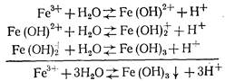 Поскольку растворимость Fe(OH)2 велика и он значительно диссоциирован, равновесие гидролиза сильно смещено влево. Образующийся Fe(OH)2 под действием кислорода, растворенного в воде, окисляется в Fe(OH)3: