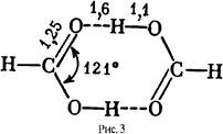 Благодаря водородным связям молекулы объединяются в ассоциаты (димеры или полимеры). Последние могут иметь линейное, разветвленное или кольчатое строение. Так, муравьиная кислота как в жидкой, так и в газообразной фазе существует главным образом в виде димера; его структура установлена методом электронографии (см. рис.3). Способность к ассоциации отличает воду, спирты, и многие другие жидкости от неассоциированных жидкостей (например от углеводородов). Ассоциация приводит к повышению температуры плавления, температур сублимации и кипения, теплоты парообразования, а также к изменению взаимной растворяющей способности веществ.