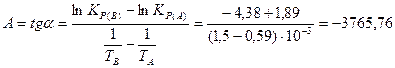 Уравнение (11) отвечает линейной зависимости lnKP = f(1/T). Определим коэффициенты А и В графически. С этой целью по уравнению (9) и данным табл. 4 рассчитаем величину lnKP, в заданном интервале температур. Например для температуры 900 К: