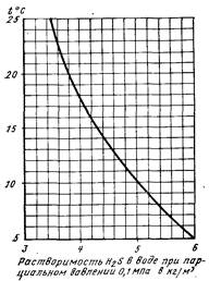 Рис. 19.7. Растворимость сероводорода в воде в зависимости от ее температуры при его парциальном давлении 0,1 МПа.