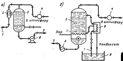 Рис. 19.8. Установки дегазации воды под вакуумом без подогрева ( и с подогревом (б)