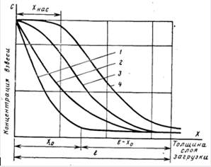 Извлечение примесей из воды и их закрепление на зернах фильтрующей загрузки происходит под действием сил адгезии. Осадок, накапливающийся в загрузке из задержанных примесей, имеет весьма непрочную структуру. Под влиянием гидродинамических сил потока эта структура разрушается и некоторая часть ранее прилипших частиц отрывается от зерен загрузки в виде мелких хлопьев и переносится в последующие слои загрузки (суффозия), где вновь задерживается в поровых каналах. Следовательно, осветление воды в зернистой загрузке следует рассматривать как суммарный результат двух противоположных процессов: процесса адгезии и процесса суффозии. Осветление воды в каждом элементарном слое загрузки происходит до тех пор, пока интенсивность прилипания частиц превышает интенсивность их отрыва. По мере накопления осадка интенсивность отрыва частиц увеличивается. Кинетика прилипания и отрыва частиц определяет ход процесса осветления воды по толщине слоя фильтрующей загрузки и во времени (рис. 12.3, где показаны кривые изменения концентрации взвеси в воде по высоте загрузки). Каждая кривая относится к определенному моменту времени. Кривая 1 характерна для начального периода процесса после того, как первые порции фильтруемой воды пройдут через слой загрузки, а кривая 4 — предельному насыщению загрузки осадком. Кривая 1 показывает, как изменяется концентрация взвеси в воде по высоте загрузки толщиной ха только под действием сил прилипания.