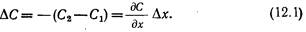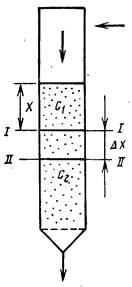 Одной из основных задач изучения закономерностей процесса осветления воды фильтрованием является нахождение времени защитного действия загрузки. Выделим в моделе фильтра элементарный слой загрузки толщиной Δх на расстоянии х от ее поверхности (рис. 12.5). К верхнему сечению слоя площадью равной единице, подходит вода с массовой концентрацией частиц С1 а через нижнее сечение она выходит из слоя с концентрацией С2. Уменьшение концентрации частиц в элементарном слое составляет