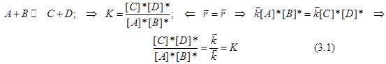 (приход реагента в единице объёма) - (расход реагента в единице объёма) = (изменение концентрации реагента). Поступление реагента определяется скоростью его введения в систему из окружающей среды (для открытых систем) и суммой скоростей его образования в объёме V. Расход реагента определяется скоростью его отвода из системы (в открытых системах) и сумой скоростей его исчезновения в параллельно протекающих реакциях. Для открытой системы получается: