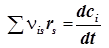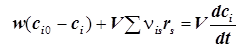 где w -объёмная скорость поступления реагента в реактор, t -время, rs -скорость одной из химических реакций, V - объём реактора, is -стехиометрический коэффициент реагента в реакции (по правилу IUPAC), ci 0 -начальная концентрация реагента в реакторе, ci -текущая концентрация реагента в реакторе.