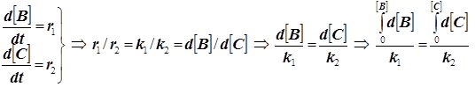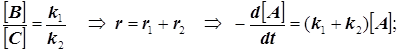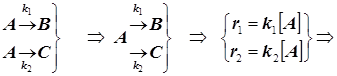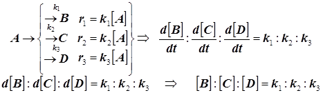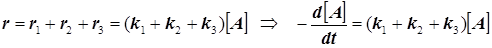 убыль реагента протекает как в обычной реакции первого порядка с эффективной константой скорости, равной сумме констант скоростей параллельных реакций k=k1+k2+k3 . В более сложных случаях всё аналогично .