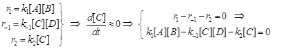 Проблема систематического описания сложных реакций сложна, и в наиболее общем виде решается лишь численными (и не аналитическими) методами . Разработаны различные аналоговые методы, позволяющие даже в очень непростых случаях эффективно графически моделировать кинетические кривые. Вместе с тем часто есть возможность избежать последовательного решения системы дифференциальных уравнений, заменяя точные решения приближёнными. Не располагая возможностью рассмотреть всю проблему в полном объёме, мы вынуждены ограничиться лишь несколькими характерными примерами …
