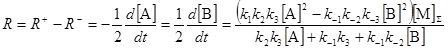 С позиций стехиометрии и материального баланса уравнения (1) и (5) линейно зависимы. С позиций кинетических скорость реакции превращения А в В есть скорость по итоговому уравнению (5) и именно эта скорость R, как разность скоростей в прямом (R+) и обратном (R–) направлениях (R = R+ – R–) соответствует механизму (2 – 4). При [А], [В] >> [М]Σ и [М]Σ >> [МА], [МВ] ([М]Σ @ [М]) получаем для стационарного или квазистационарного режимов