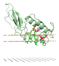 Фосфолипаза А2 пчелиного яда во внеклеточном пространстве вблизи липидного бислоя. Полярные группы фосфолипидов находятся между жёлтой и красной плосткостями. Неполярные ацильные цепи — между красной и чёрной плоскостями.