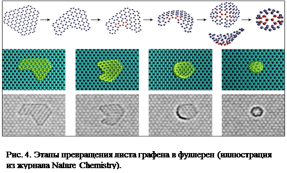 Корректно интерпретировать результаты пионерских наблюдений помогло квантовохимическое моделирование. Как выяснилось, превращение обычного листа графена в составленный из атомов углерода выпуклый замкнутый многогранник–фуллерен–проходит в четыре этапа.