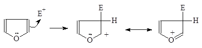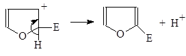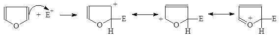 Фуран вступает в обычные для ароматических соединений реакции электрофильного замещения, причем легче, чем бензол.