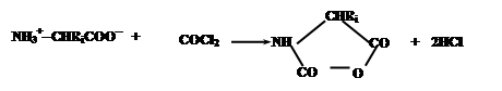 В качестве примера можно привести процесс получения полиаминокислот, основанный на конденсации N-карбоксиангидридов аминокислот, образуемых из соответствующих аминокислот обработкой фосгеном: