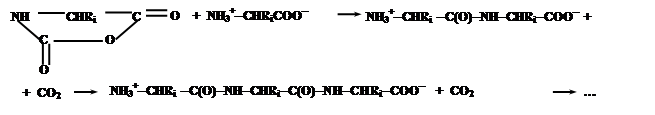 Эти соединения содержат электрофильную ангидридную группу, которая может атаковать алифатическую аминогруппу аминокислоты, используемой в качестве затравки, с выделением СО2 и одновременном освобождением новой аминогруппы из атакующей молекулы N-карбоксиангидрида, таким образом, открывая возможность поликонденсации: