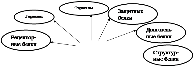 Функции белков чрезвычайно многообразны. Каждый данный белок как вещество с определенным химическим строением выполняет одну узкоспециализированную функцию и лишь в нескольких отдельных случаях — несколько взаимосвязанных. Например, гормон мозгового слоя надпочечников адреналин, поступая в кровь, повышает потребление кислорода и артериальное давление, содержание сахара в крови, стимулирует обмен веществ, а также является медиатором нервной системы у холоднокровных животных.