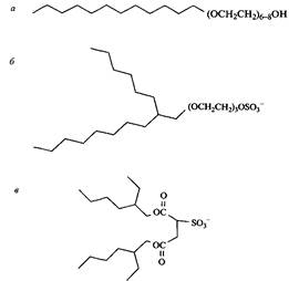 Примеры молекулярных структур ПАВ, пригодных для получения микроэмульсий различных типов: а – этоксилированный спирт, при температурах ниже точки помутнения используется для получения микроэмульсий типа «масло в воде»; б – сульфоэфир с разветвленными углеводородными радикалами, пригоден для получения биконтинуальных микроэмульсий; в-сульфонат с двумя неполярными радикалами, пригоден для получения микроэмульсий «вода в масле»