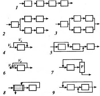 Последовательная связь (схема 1 на рис. 3.2). Поток проходит аппараты поочередно. Применение: последовательная переработка сырья в разных операциях, более полная переработка сырья последовательными воздействиями на него, управление процессом путем необходимого управляющего воздействия на каждый элемент.