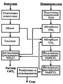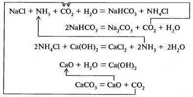 Последовательность химических взаимодействий удобно представить и такой схемой, как, например, производство соды Nа2СОз из поваренной соли NaCl и известняка СаС03:
