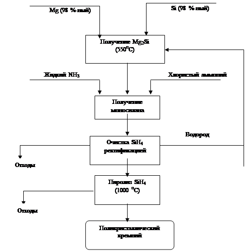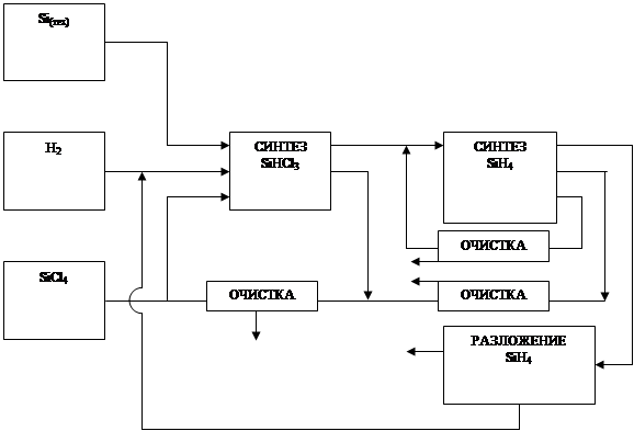 Получение поликристаллического полупроводникового кремния пиролизом SiH4. Процесс состоит из следующих основных стадий: