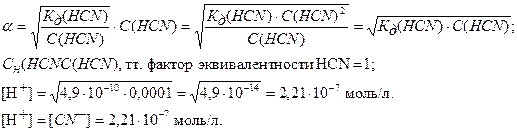 Дано: Vр-ра = 282 см3 СN(HCN)=0,0001 н Kд(HCN)=4,9*10-10 | Решение: HCN – циановодородная кислота, это слабая кислота, диссоциирует по уравнению: HCN=H++CN- Концентрация продиссоциировавших молекул, а, следовательно, и концентрация ионов H+: |