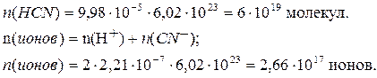 Сколько растворенных частиц (ионов и недиссоциированных молекул) содержит 1 л 0,0001 н. HCN, константа диссоциации которой равна 4,9-10 -10?