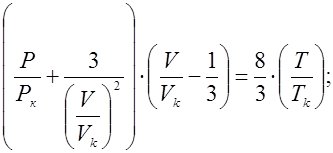 Уравнение (1) отсутствует параметр относящийся к конкретному веществу, поэтому можно ожидать, что оно выполняется для определений совокупности веществ, следует, что из (1) при равенстве двух приведенных параметров нескольких веществ, третий приведенный параметр также должен быть одинаковым для всех веществ – закон соответственных состояний.