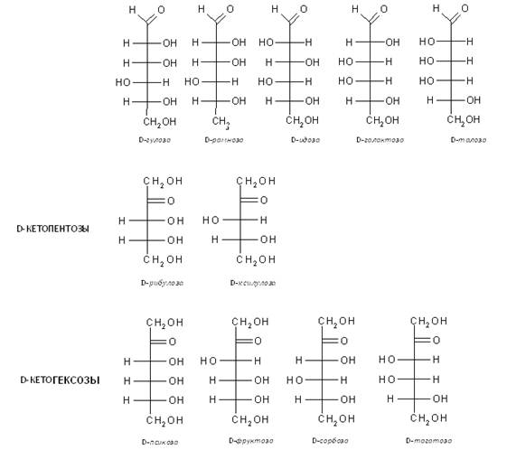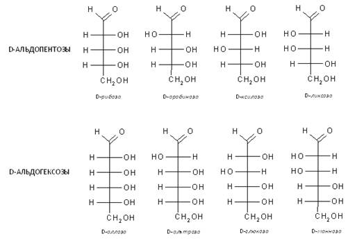В качестве обозначения противоположных конфигураций редуцирующих сахаров с одинаковыми названиями применяются буквы D и L, которые указывают принадлежность к двум рядам. Последний асимметрический атом углерода определяет принадлежность к стереохимическому ряду. Гидроксильная группа справа – D – ряд; слева – L – ряд. В природе одни моносахариды встречаются больше в Д-конфигурации, чем в L, другие наоборот (L-арабиноза часто встречается в растениях, тогда как D-арабиноза обнаружена только в некоторых видах бактерий).