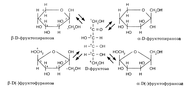Сахара-кетозы также встречаются в форме α- и β-аномерных форм. В этих соединениях гидроксильная группа у предпоследнего (или последнего) реагирует с кетогруппой, образуя фуранозный (или пиранозный) цикл, содержащий полукетальную связь: