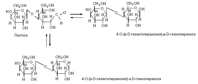 Данным сахарам также присуща мутаротация, и они существуют в a- и b-формах. в циклических и альдегидной таутомерных формах, находящихся в динамическом равновесии: