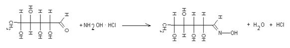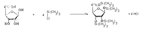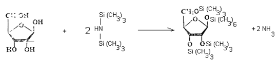 Для упрощения идентификации и количественных расчетов (если не требуется знания аномерного состава сахаров) определение сахаров производят в виде ТМС-производных сахаров. В подготовленную пробу образца добавляют 100 г гидроксиламина солянокислого, приливают 10 см3 пиридина и выдерживают в термостате при 80 °С в течение 2 часов: