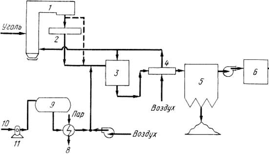 1 — топка котла; 2 — экономайзер; 3 — реактор; 4 — теплообменник для нагрева воздуха; 5 — электрофильтр; 6 — блок обессеривания топочного