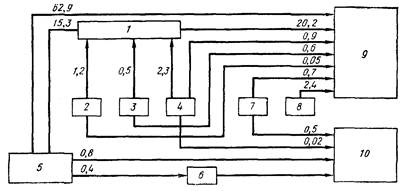 Схема потребления первичных н вторичных железосодержащих материалов при производстве железа и стали в США в 1976 г. (в миллионах американских тонн железа, 1 т = 907,2 кг)