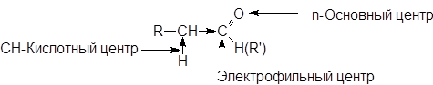 Электрофильный центр - карбонильный атом углерода, возникновение частичного положительного заряда на котором обусловлено полярностью связи С=О. Электрофильный центр участвует в реакциях нуклеофильного присоединения.
