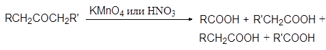 Кетоны значительно более устойчивы к окислению, чем альдегиды, т. к. рядом с карбонильной группой у них нет атома водорода. Кетоны не восстанавливают ни реактив Фелинга ни реактив Толленса. Сильные окислители, такие как перманганат калия и азотная кислота окисляют кетоны