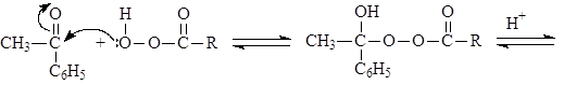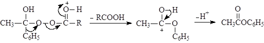 Из двух заместителей карбонильной группы к кислороду прейдет наиболее склонный к миграции. Склонность к миграции уменьшается в следующем ряду: